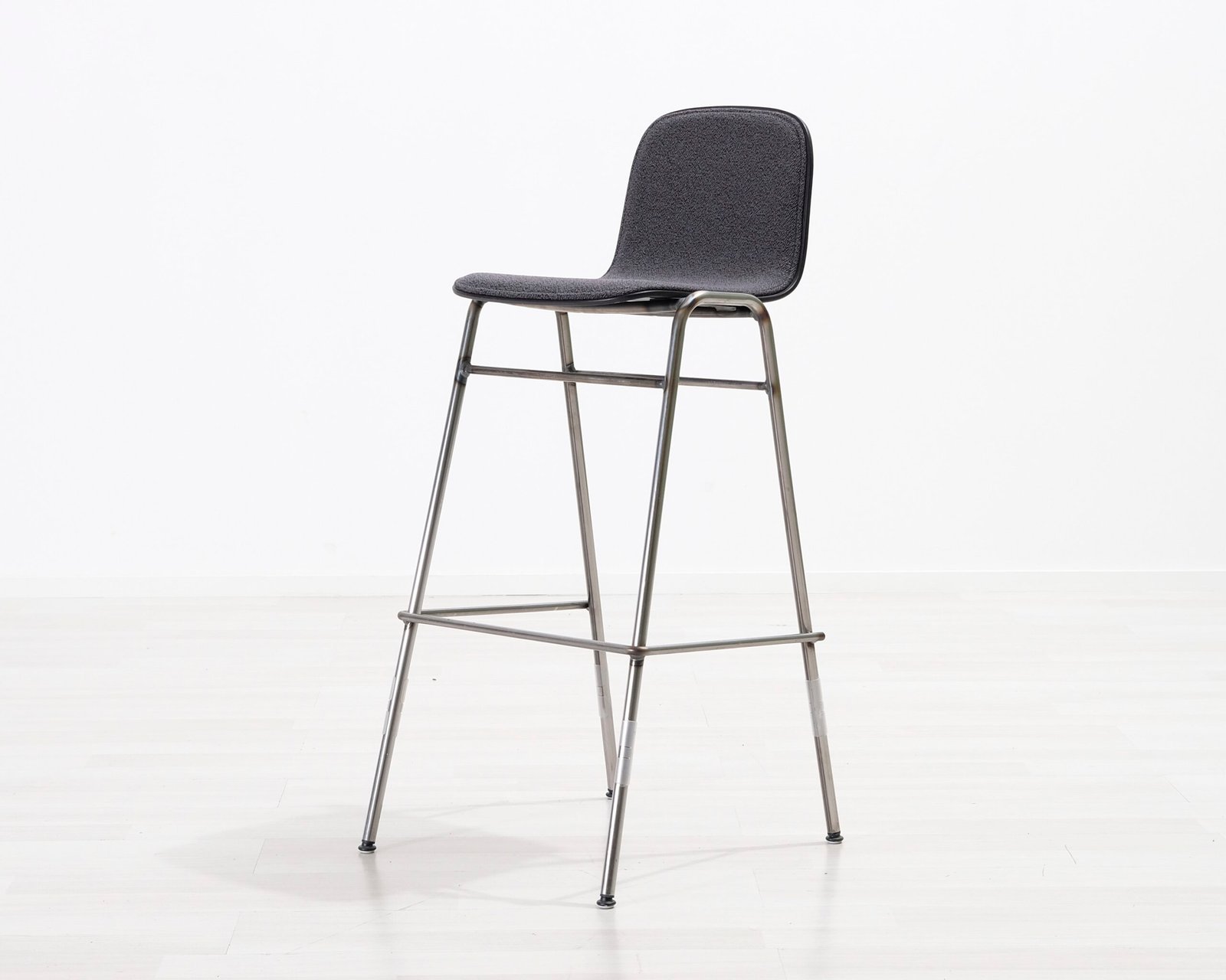 Tämä baarituoli on Hemin Touchwood-tuolin prototyyppi. Jakkaran kromijalkojen päällä lepää kangarverhoiltu istuin. Vähän värjäymää metalliosissa, muuten kuin uusi.