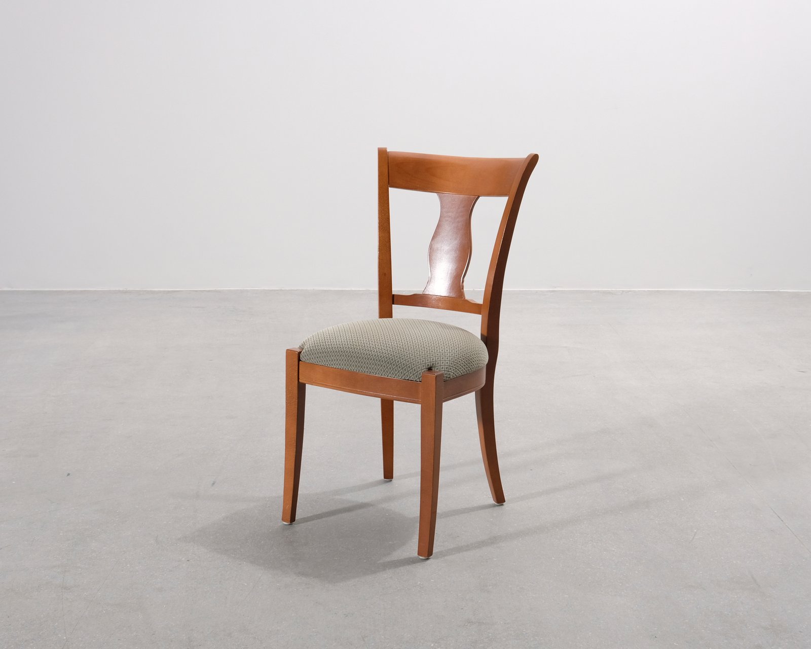 Ruokatuoli harmaanvihreällä kangasistuimella. Puusta valmistettu runko. Pieniä halkeamia puuosissa. Lakkapinta paikoittain kulunut.