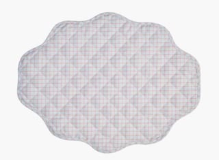 Kaksipuolinen tikattu pöytätabletti. Toisella puolella kukkakuvio ja toisella puolella ruutukuvio.