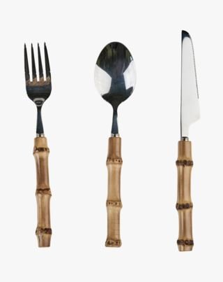 Ruokailuvälinesarja, jossa on veitsi, haarukka ja lusikka, ruostumatonta terästä ja bambukahvat. Pestävä käsin.
