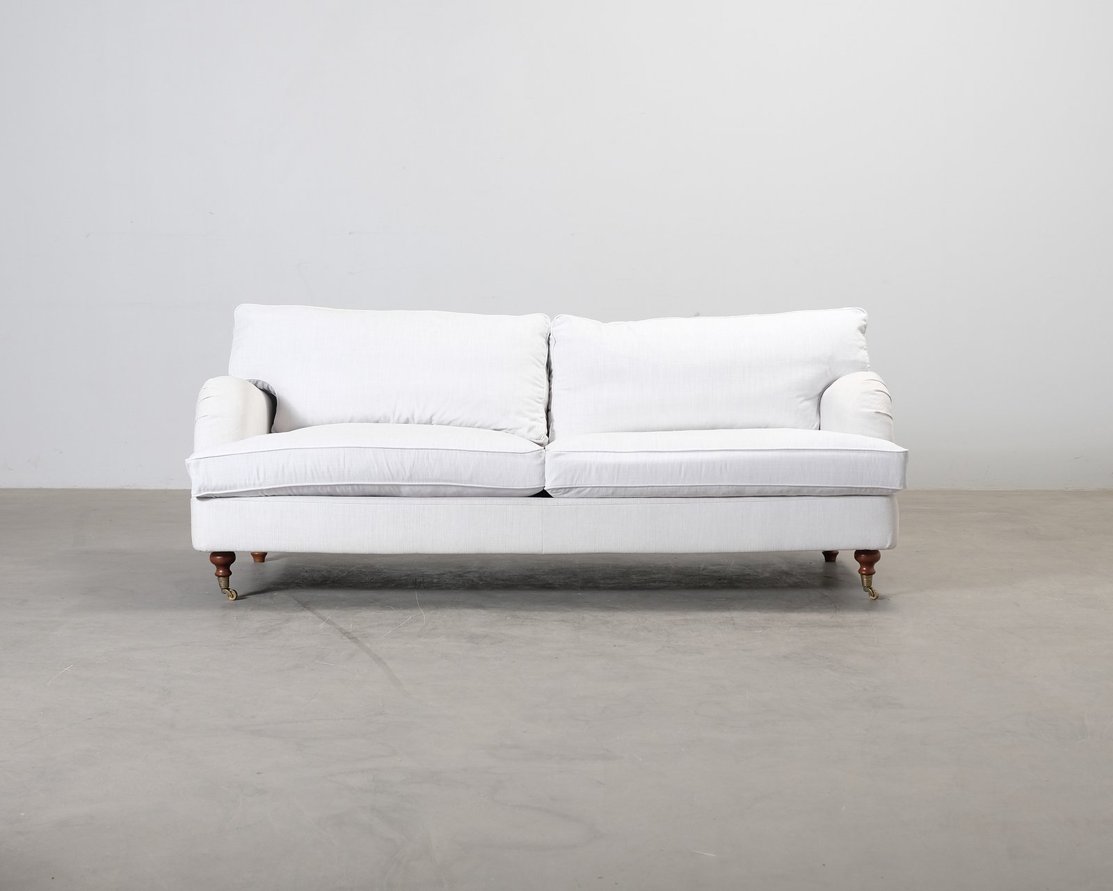Askon valmistama tyylikäs ja klassinen Howard-tyylinen 2,5-istuttava sohva valkoisella kangasverhoilulla ja kauniilla pianojaloilla. Pieniä käytön jälkiä ja verhoilussa tahroja. Yleisvaikutelma hyvä.