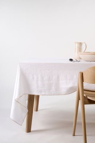 Kaunis pellavapöytäliina, jonka reunoja koristaa tyylikäs musta kontrastiommel. Sopii sekä arkeen että juhlaan. Suunnitellut Camilla Pihl Hemtexille.