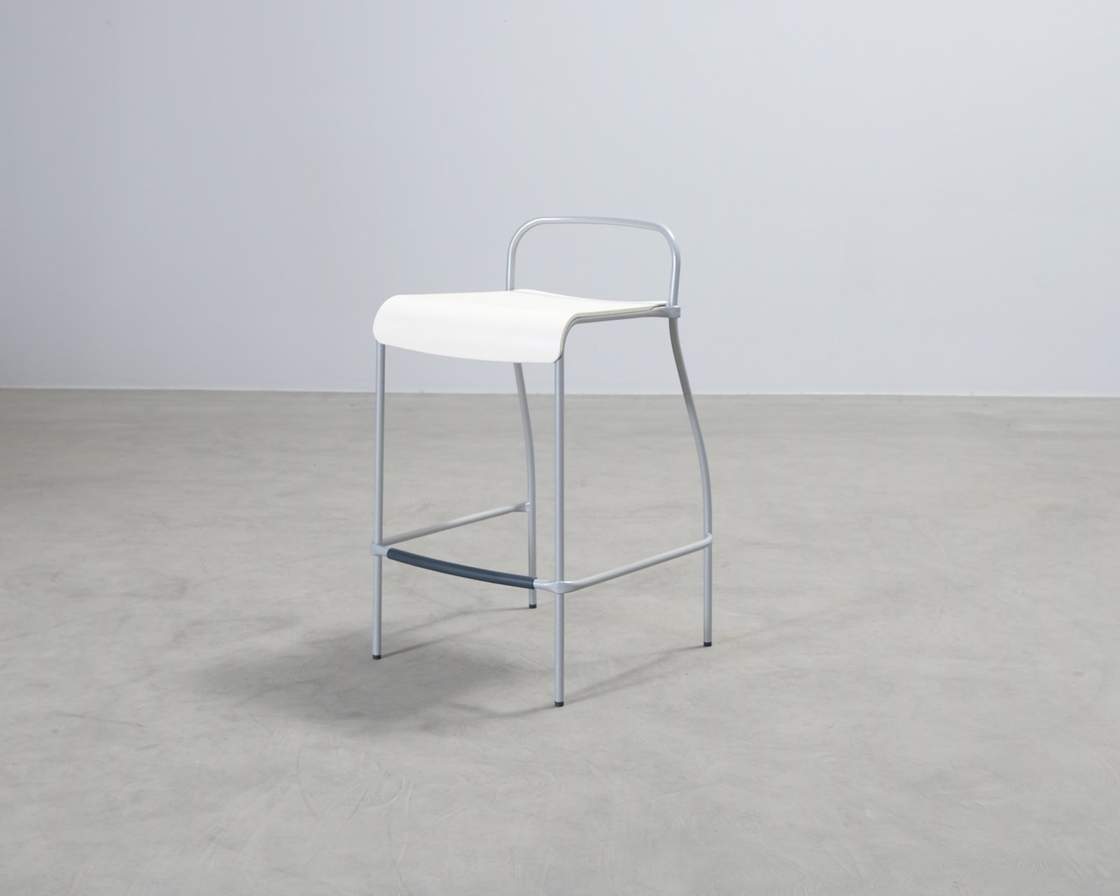 Moderni metallirunkoinen baarituoli valkoisella muovi-istuimella. Ostettu Turusta, Sisustuksen Koodi – nimisestä liikkeestä. Pinnoilla käytössä tullutta kulumaa, yleisilme siisti.