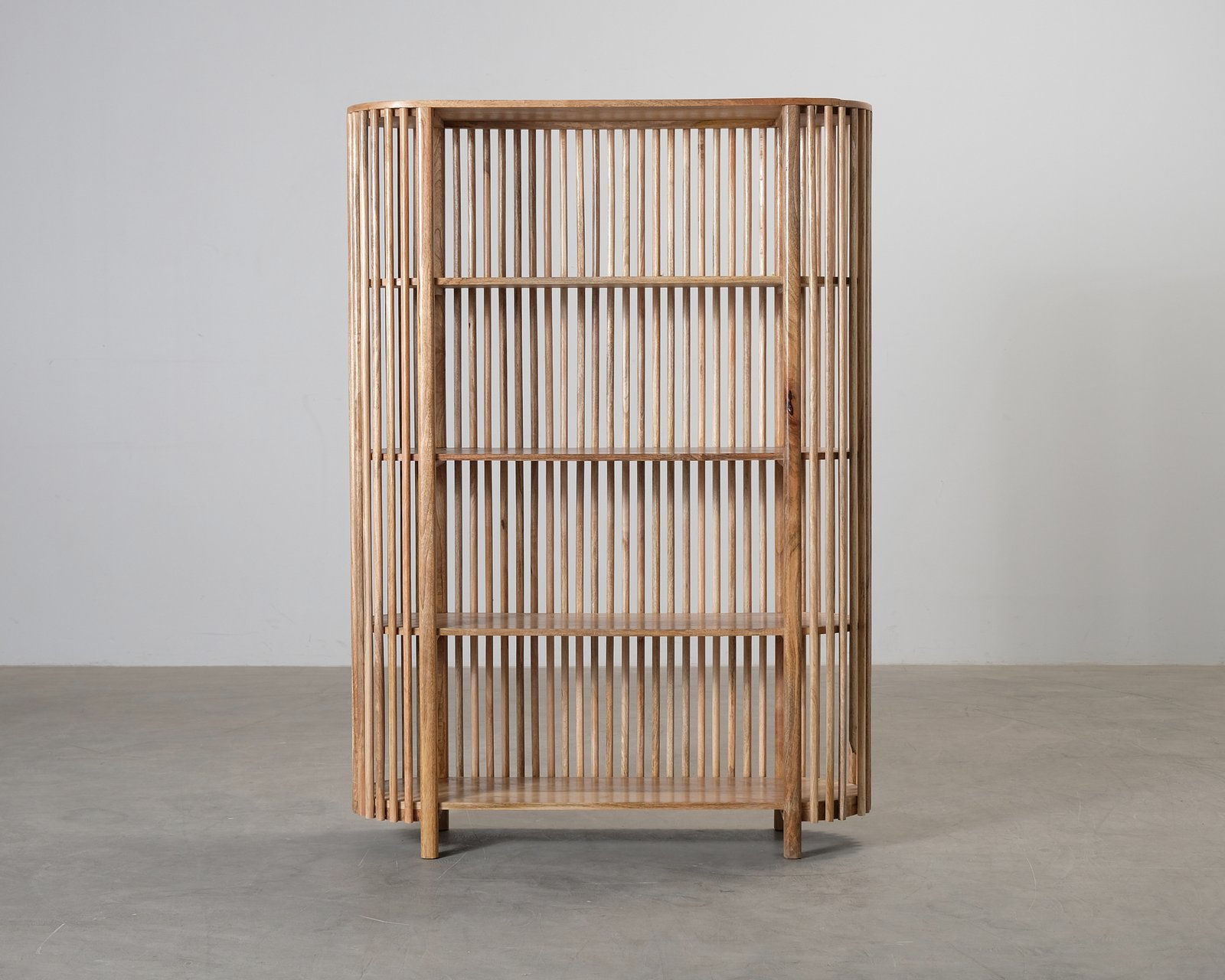 Sali on mangopuinen kirjahylly, jossa on kauniitpystypaneelit ja reilusti säilytystilaa niin kirjoille, kuin koriste-esineillekin. Sopii skandinaaviseen sisustustyyliin. Pieniä käytön jälkiä ja yksi oikeanpuoleinen rima on poikki alhaalta. Yleisvaikutelma hyvä.