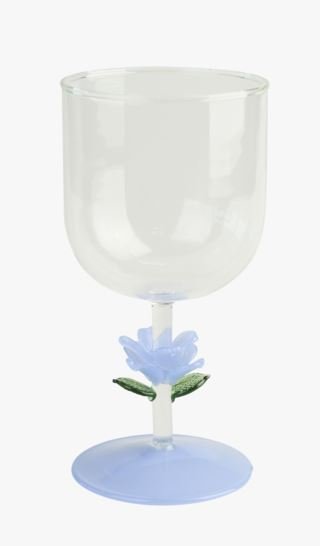 Tyylikäs viinilasi, jossa on lehtiä jalassa. Käsintehty borosilikaattilasista. Kestää konepesun.