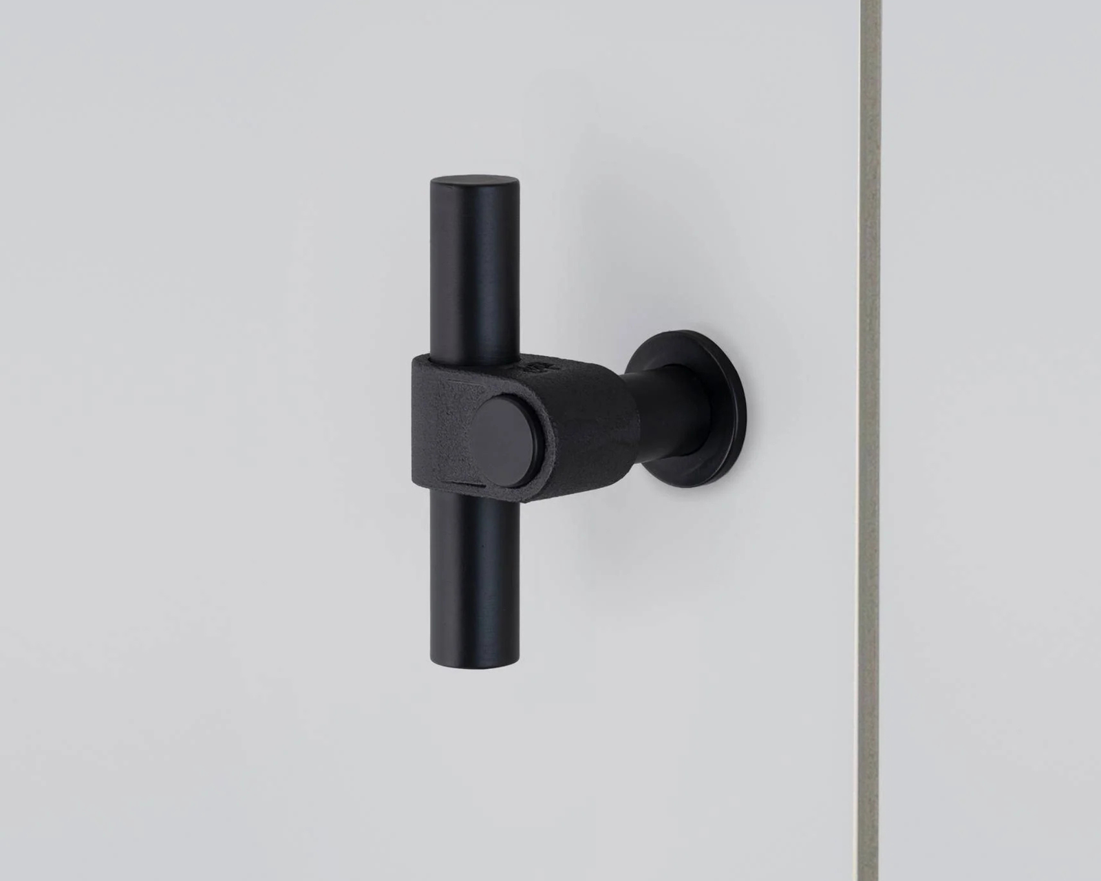 T-Bar -kahva Buster + Punch -valmistajalta. Karkea valettu nivel ja käsin kiillotettu metallinen tanko luovat yhdistelmän teollista ilmettä ja hienostunutta viimeistelyä. Sopii erinomaisesti kaapinoviin, keittiö- ja kylpyhuoneyksiköihin sekä muihin kalusteisiin, joihin tarvitaan näyttävä ja kestävä vedin. Alkuperäispakkauksessa, käyttämätön.