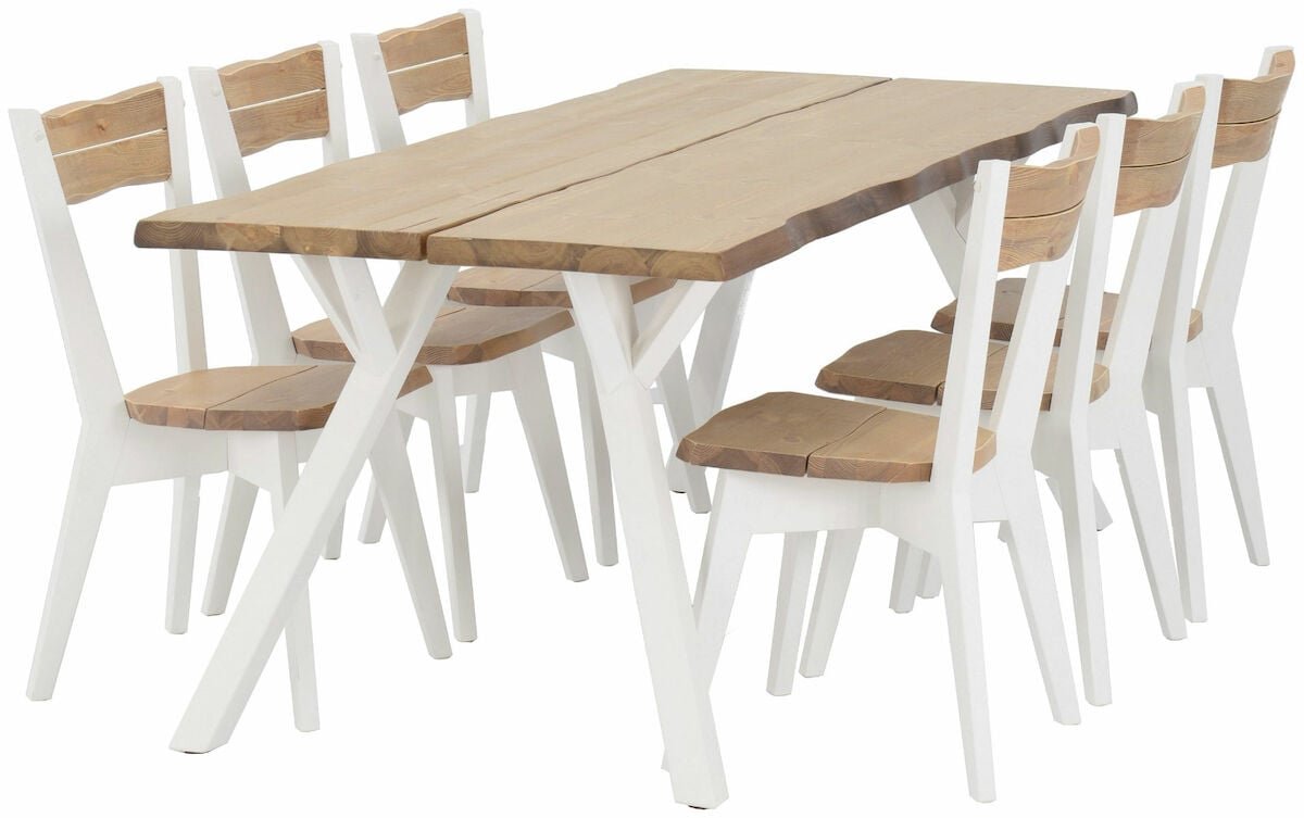 Kestävä ja tyylikäs Lana ruokailuryhmä 6-hengelle, joka on valmistettu kestävästä männystä. Ruokailuryhmä on valmistettu kestävästä ja ekologisesta männystä. Kansi on tehty kahdesta liimapuulankusta, jonka liimauksessa on käytetty vedenkestävää liimaa. Jalat ovat mäntyä. Kannessa näkyy kauniisti puun syyt ja kuviointi, joten ... Lue lisää