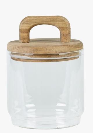 Korkea lasipurkki, jonka kansi on akaasiapuuta. Käytännöllisellä säilytyspurkilla on monia käyttömahdollisuuksia ja siitä tulee myös kaunis sisustusyksityiskohta keittiöösi.