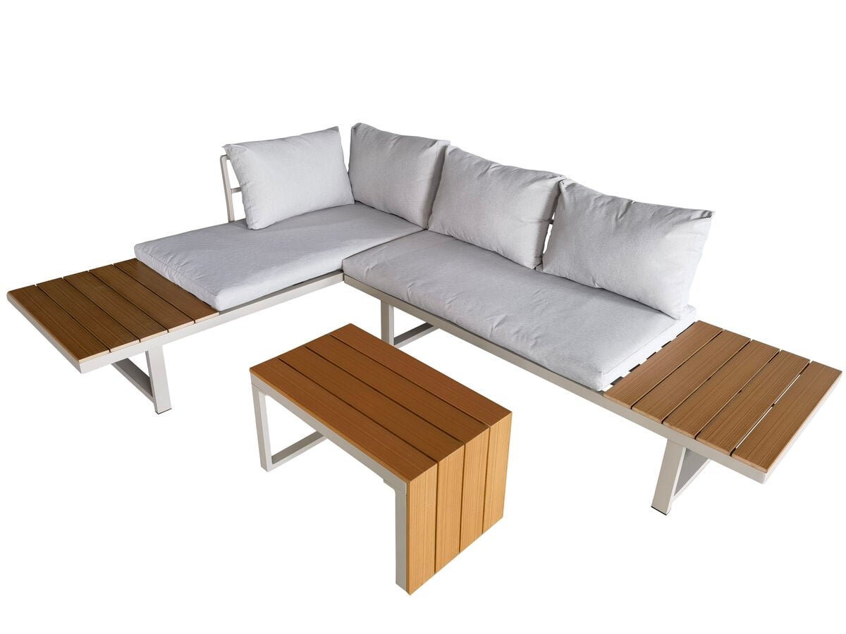 Nyborg on edullinen ja monipuolinen ulkosohvaryhmä, jossa yhdistyvät keveys, kestävyys ja tyylikäs ulkonäkö. Ruostumattomasta alumiinista valmistettu runko tekee sohvasta huoltovapaan ja pitkäikäisen, joka kestää säätä ja aikaa ilman turhaa vaivannäköä. Pintamateriaalit, jotka näyttävät puulta, on valmistettu kestävästä aintwood-materiaalista. Se tuo luonnollisen ilmeen ilman puun vaatimaa huoltoa. Sohvaryhmän irtomoduuleista voit muokata juuri omalle terassille tai parvekkeelle sopivan kokonaisuuden. Kulmamallin voi helposti muuntaa mm erillisiksi istuimiksi tai asetella ne vierekkäin, kuten kuvissa. Mukana tuleva kompakti pöytä (70×40 cm) toimii näppäränä laskutasona kahvikupille tai kesäisille tarjoiluille. Pöytää voi käyttää niin pystyssä kuin vaakassa, riippuen kuinka sohvan moduulit on aset…