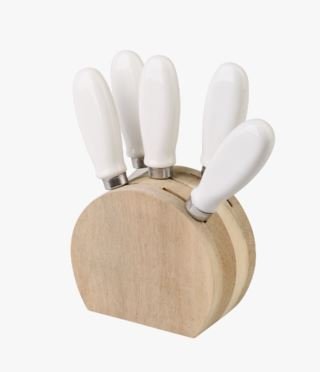 Tyylikäs juustosetti, jossa on keraamiset kahvat ja akaasiapuinen teline.