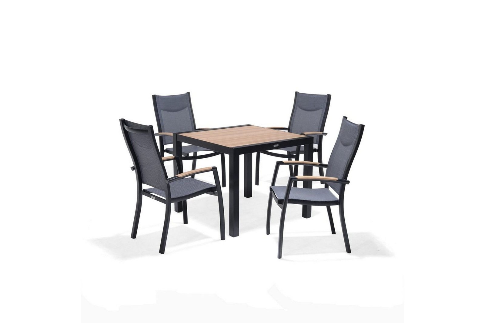 PANAMA SETTI: pöytä 90 4 pinottavaa nojatuolia PANAMA SETTI: pöytä 90 4 pinottavaa nojatuolia Ulkona neliönmuotoinen ruokailusetti 4 henkilölle, sisältää pöydän 90*90*75(K) cm ja 4 pinottavaa nojatuolia. Esineet mustaa alumiinia, jossa on hiottu vaikutus, painettu puuefekti käsinoja ja pöytälevy. Vahva, ... Lue lisää