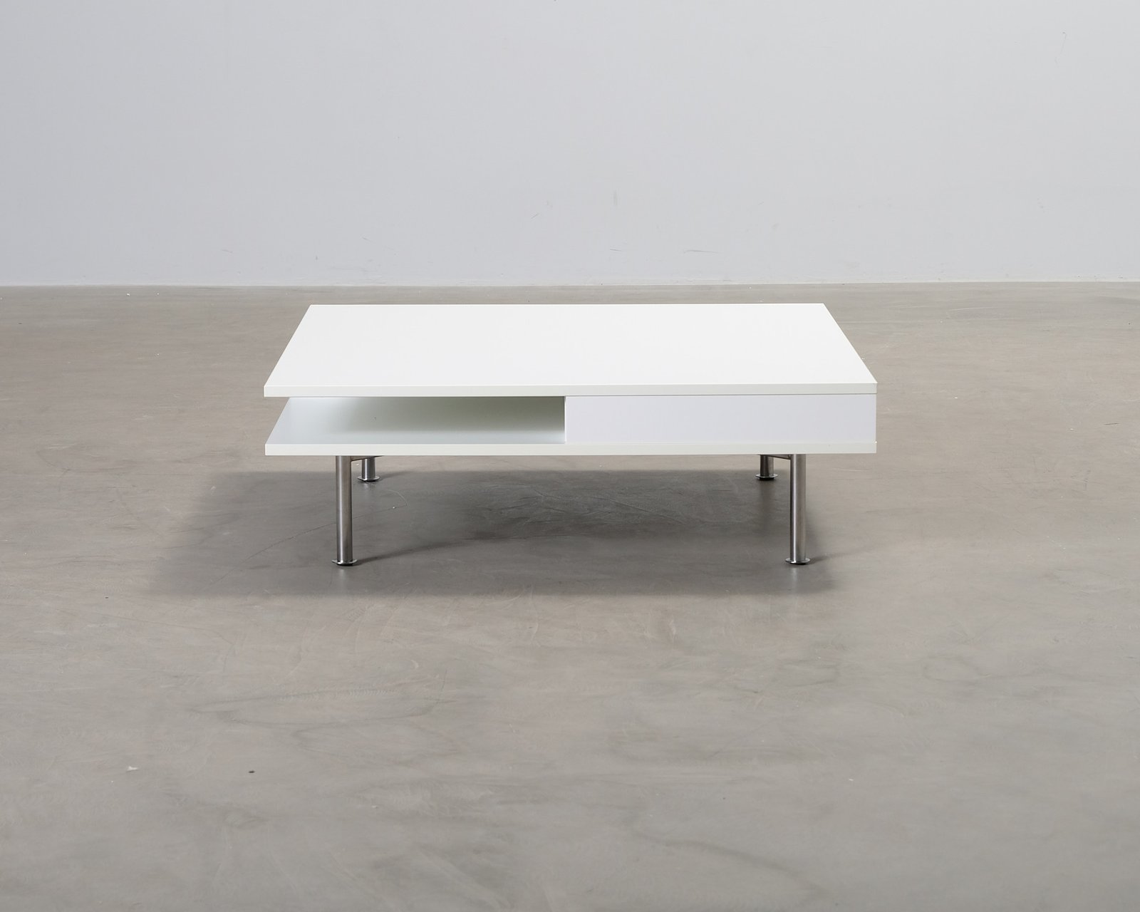Tyylikäs valkoinen sohvapöytä metallisilla yksityiskohdilla ja avohyllyllä ja laatikolla. Pinnassa paljon pintanaarmuja ja muutamia pieniä kolhuja.