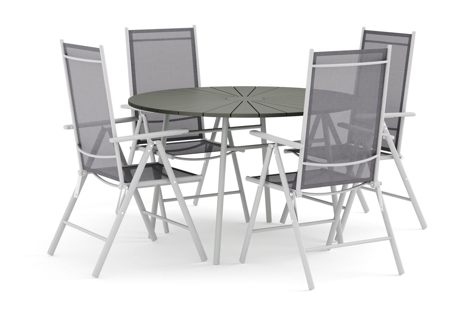 Tunis-pyöreä ulkoruokailuryhmä 120 cm, 4 Maggie-säätötuolia – Valkoinen/Harmaa