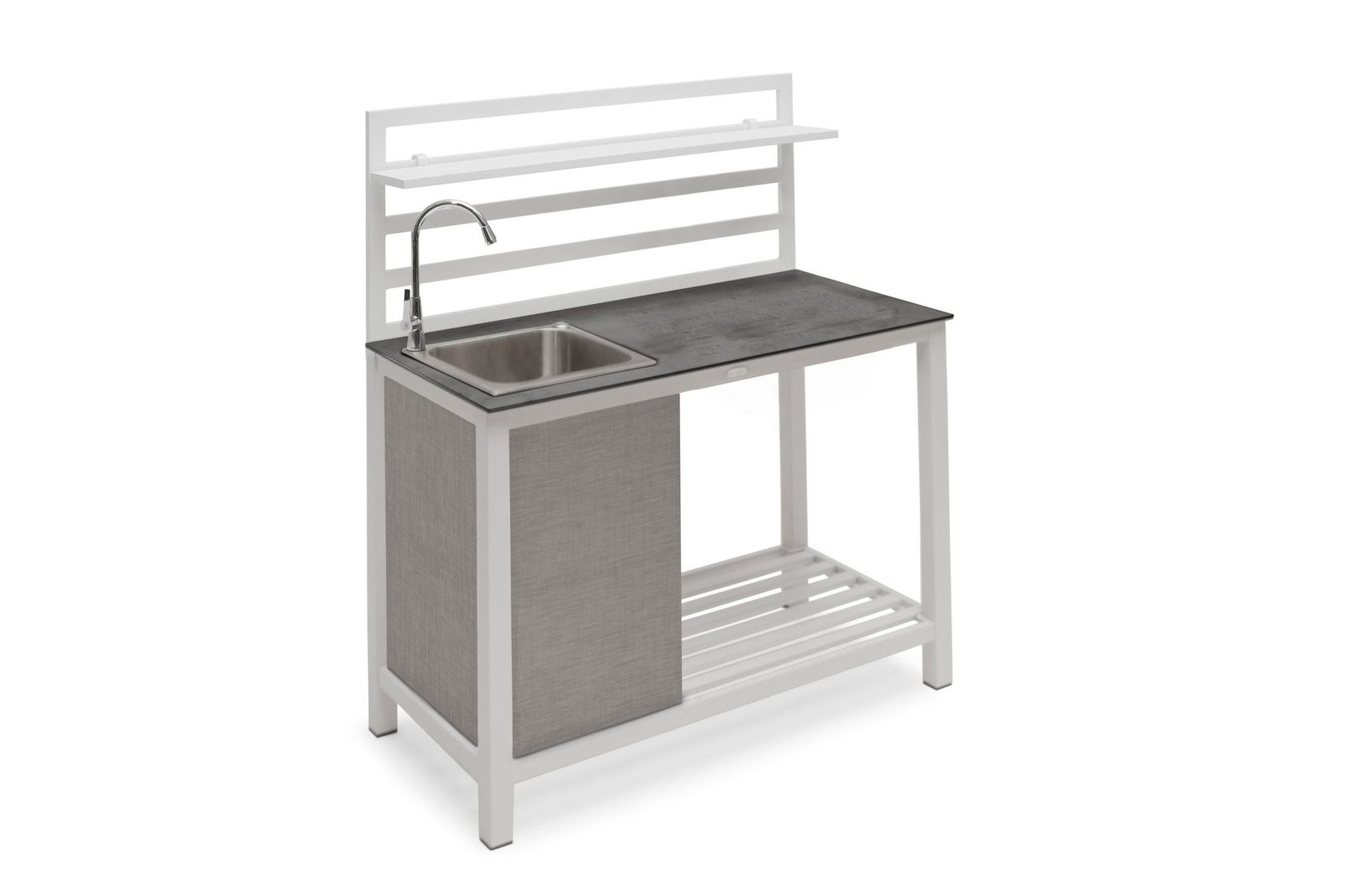 Kuka ei haluaisi laittaa ruokaa ulkona? Kesän pakollinen ja juhlien selvä keskipiste on ulkokeittiö! Täydellinen tyylikäs ulkokeittiö, joka sisältää valkoisen alumiinirungon, valkoisen hyllyn, harmaamarmorisen työtason, altaan sekä kangassuojan. Allas on sijoitettu vasemmalle puolelle. Hana voidaan sijoittaa joko altaan vasemmalle tai ... Lue lisää