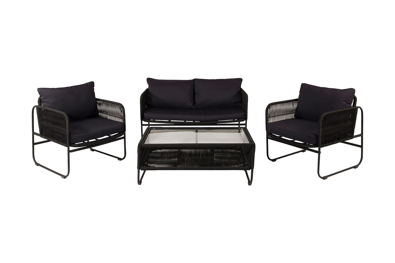 Tule kotiin viihtyisään Utah-sarjan loungeryhmään! Tämä miellyttävä, modernisti muotoiltu loungeryhmä koostuu kahden hengen sohvasta, kahdesta käsinojallisesta nojatuolista, jotka on valmistettu mustaksi jauhemaalatusta metallista ja joissa selkänoja sekä sivut on suunniteltu mustasta köydestä, sekä suorakulmaisesta matalasta sohvapöydästä, jossa on alahylly, lasikansi ja mustat köysiyksityiskohdat. Sohvaryhmän mukana tulevat pehmeät mustat pehmusteet! Inspiroidu trendikkäästä muotoilusta ja nauti myöhäisistä kesäilloista mukavassa loungeryhmässä! Hoito-ohjeet: Köytemme ovat laadukkaita kehrättyjä polyesteriköysiä, jotka on helppo puhdistaa. Kalusteet on käsitelty kestämään 500–2000 tuntia. Suosittelemme puhdistukseen mäntysuopaa ja vettä. Anna kuivua ilmakuivaten.